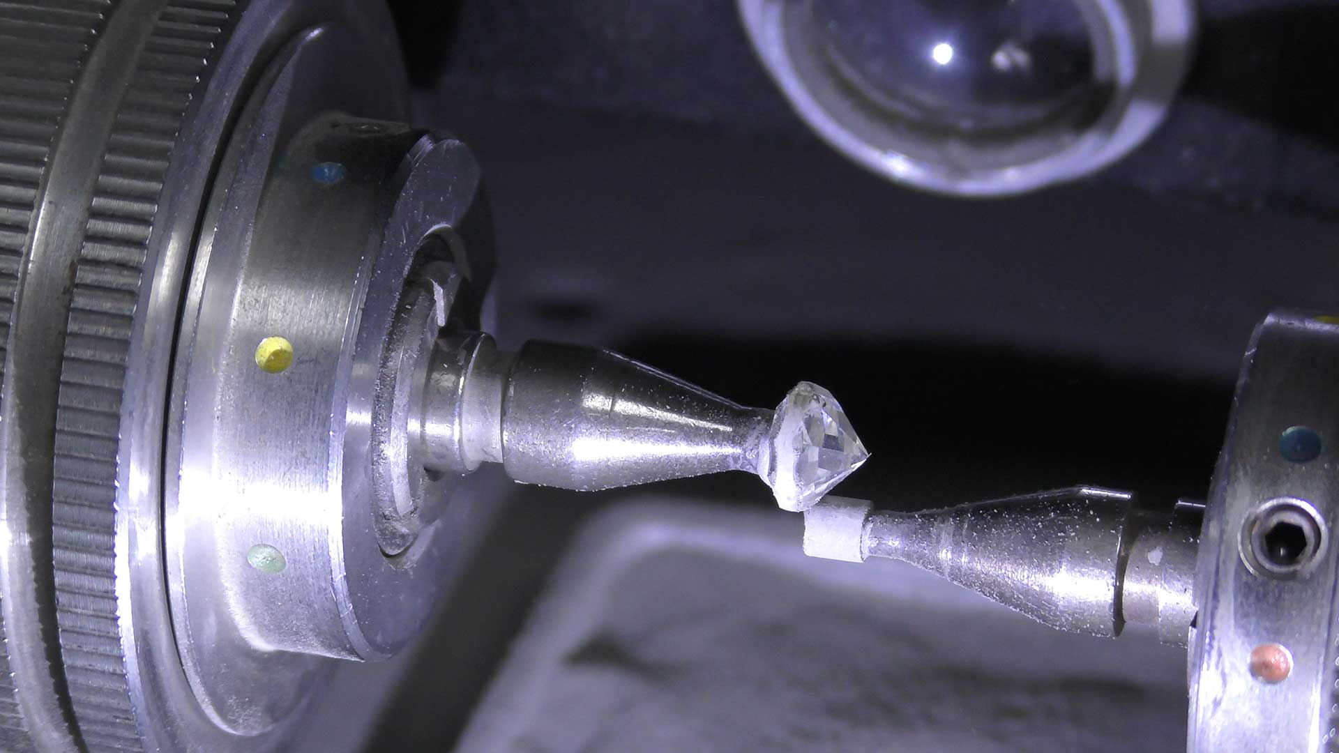 Previously done entirely by hand, this process is a preliminary step to faceting. Rough cutting consists of rounding the surfaces of the rough diamond, giving it a first shape, both for the upper part (the table) and the lower part (the breech). The first step in rough cutting is carried out using a machine, a mechanical lathe in the middle of which a lower quality diamond is fixed, against which the craftsman will come and apply the diamond to be worked, set at the end of a stick, using cement.