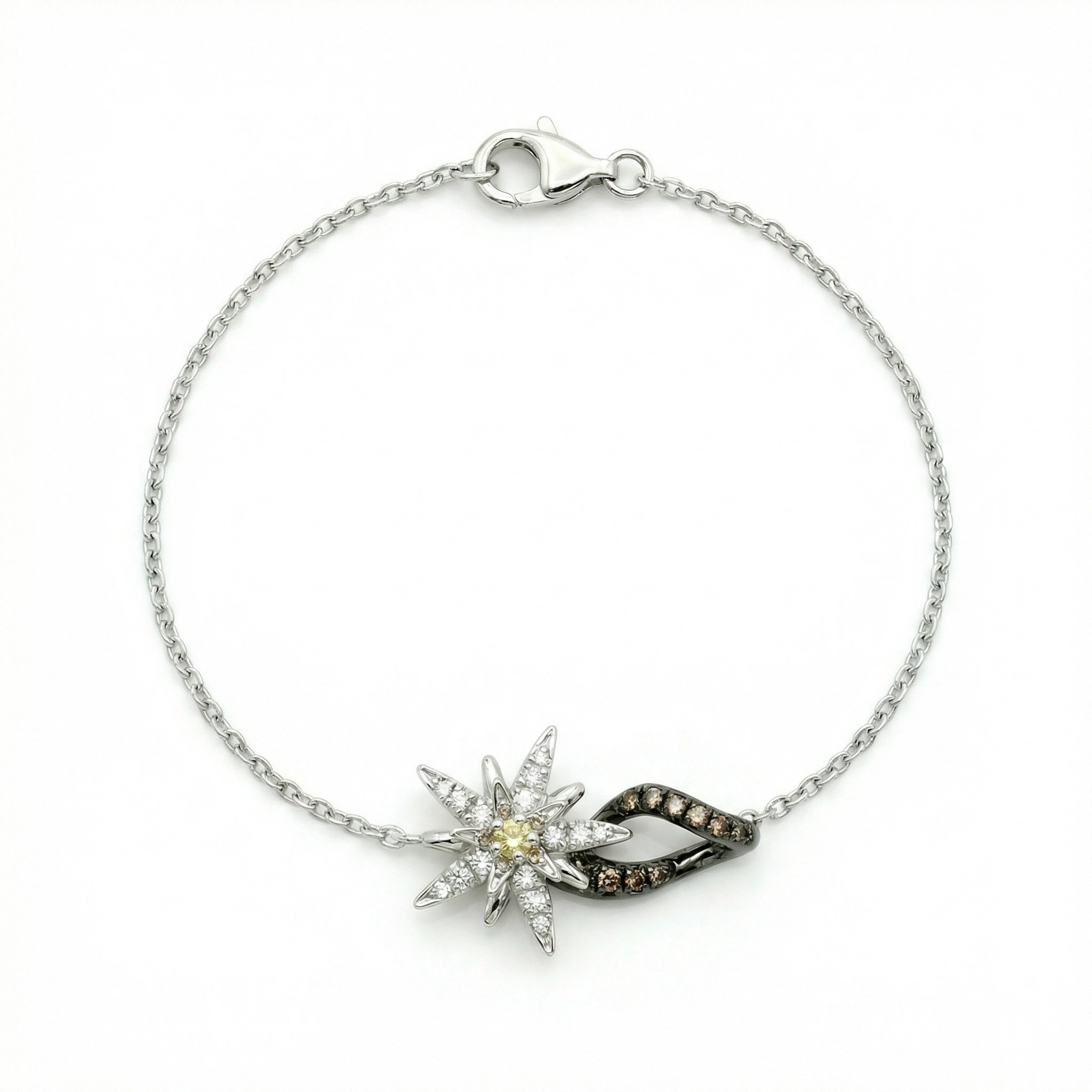 The "Terre d'Edelweiss" flower bracelet invites us on a journey to the mountains, to contemplate the queen of the Alps. The band is crafted in black gold, a color imbued with mystery. The flower is sprinkled with white diamonds, with a central yellow diamond that radiates like a bright winter sun. Diamond weight: a total of 0.35 carats of F VS white diamonds on the flower, brown diamonds on the band, and a yellow diamond at the center. Gold weight: 4.5 grams of 18k (750/000) white and black gold. Flower dimensions: 13mm wide, 4mm high. Adjustable chain length. Handmade. Made in France.