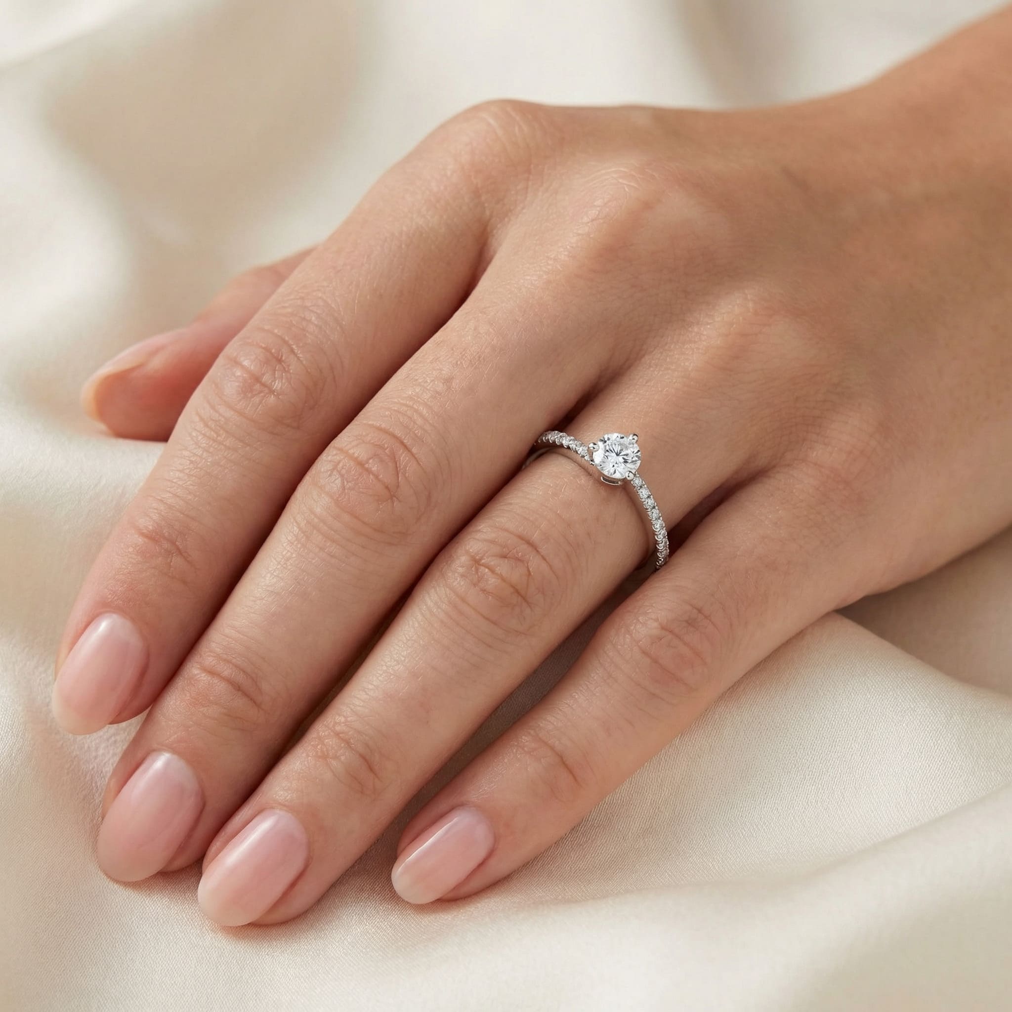 Our jewels are set in France by setters with French know-how to guarantee quality and solidity. Ring set with pavé diamonds on each side of the center diamond and a total weight of +/- 0.20 carat depending on the weight of the center diamond. Paving quality: color F and purity VS. Width of the ring in proportion to the diameter of the diamond chosen and the paving diamonds, for example a ring of 2mm wide for a diamond of 5mm in diameter (0.50 carat).