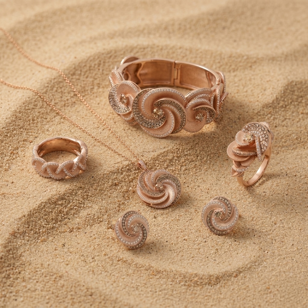 Le soir venu, elle pointe du doigt l’horizon et laisse le soleil se coucher sur la bague Rose des Sables comme sur un lit de dunes.
