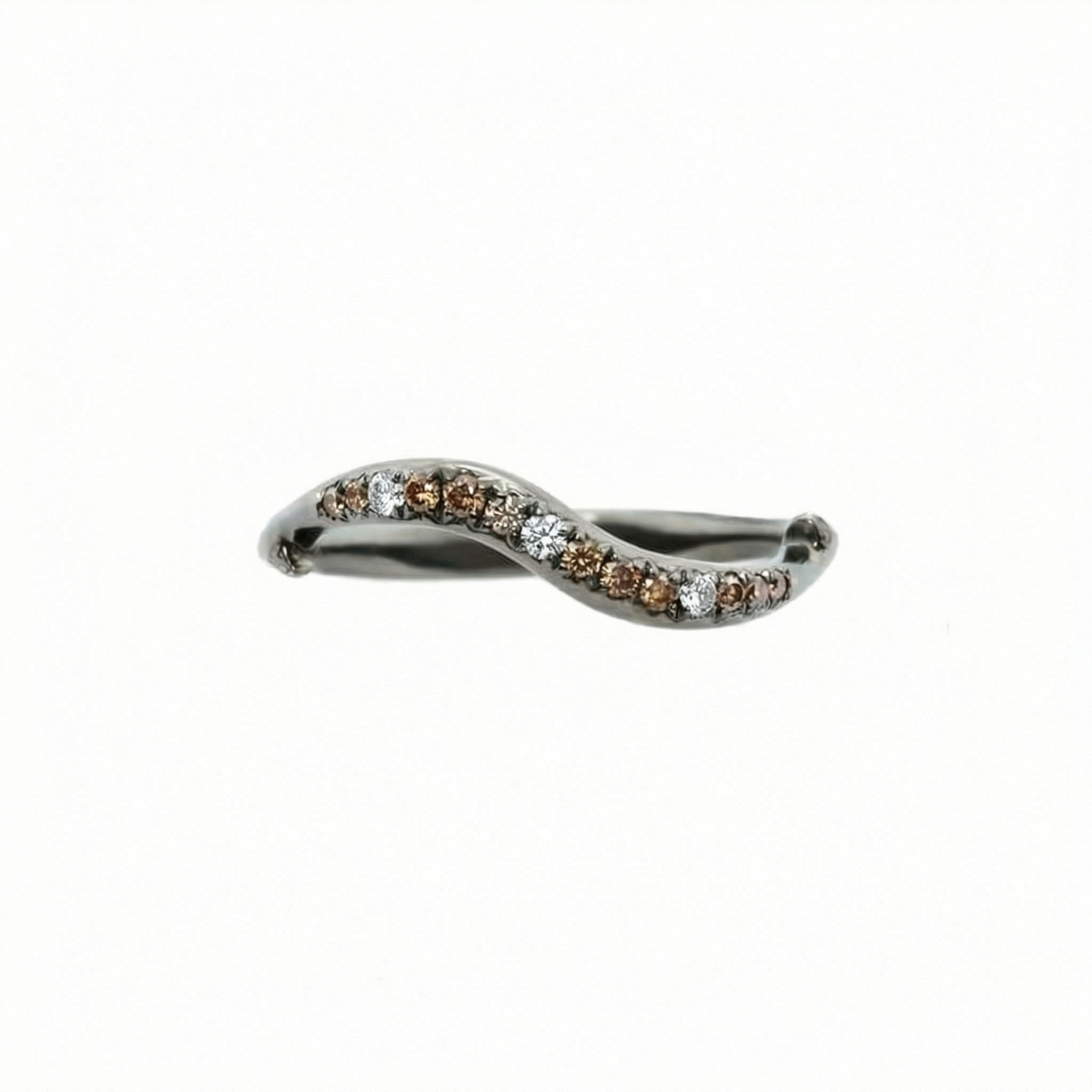 L'alliance « Terre d’Edelweiss » nous entraine dans un voyage en montagne, à la contemplation de la reine des Alpes. L’anneau enrobe le doigt d’or noir, teinte de tous les mystères. Poids de diamants : un ensemble total de 0.16 carat de diamants blancs F VS et diamants bruns sur l'anneau. Poids d’or : 2 grs d’or noir 18k (750/000). Fait main. Fabrication française.
