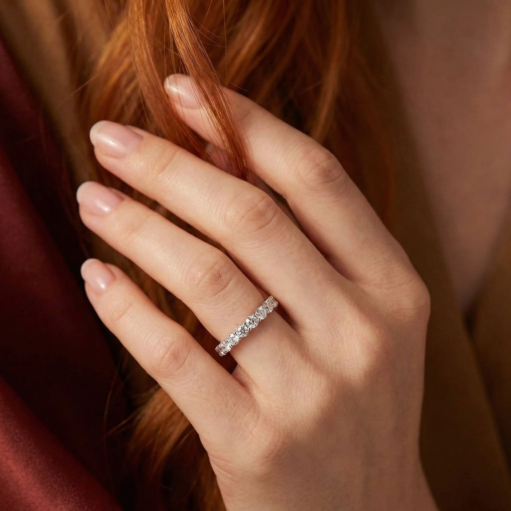 Alliance diamants Karma à 2 griffes. Or blanc, jaune ou rose 18k (750/000). Poids d'or 3 grs. Alliance diamants tour complet sertie de 24 diamants en couleur F et pureté VS. Fait main sur mesure, fabrication française. Livrée avec écrin luxe en bois verni.