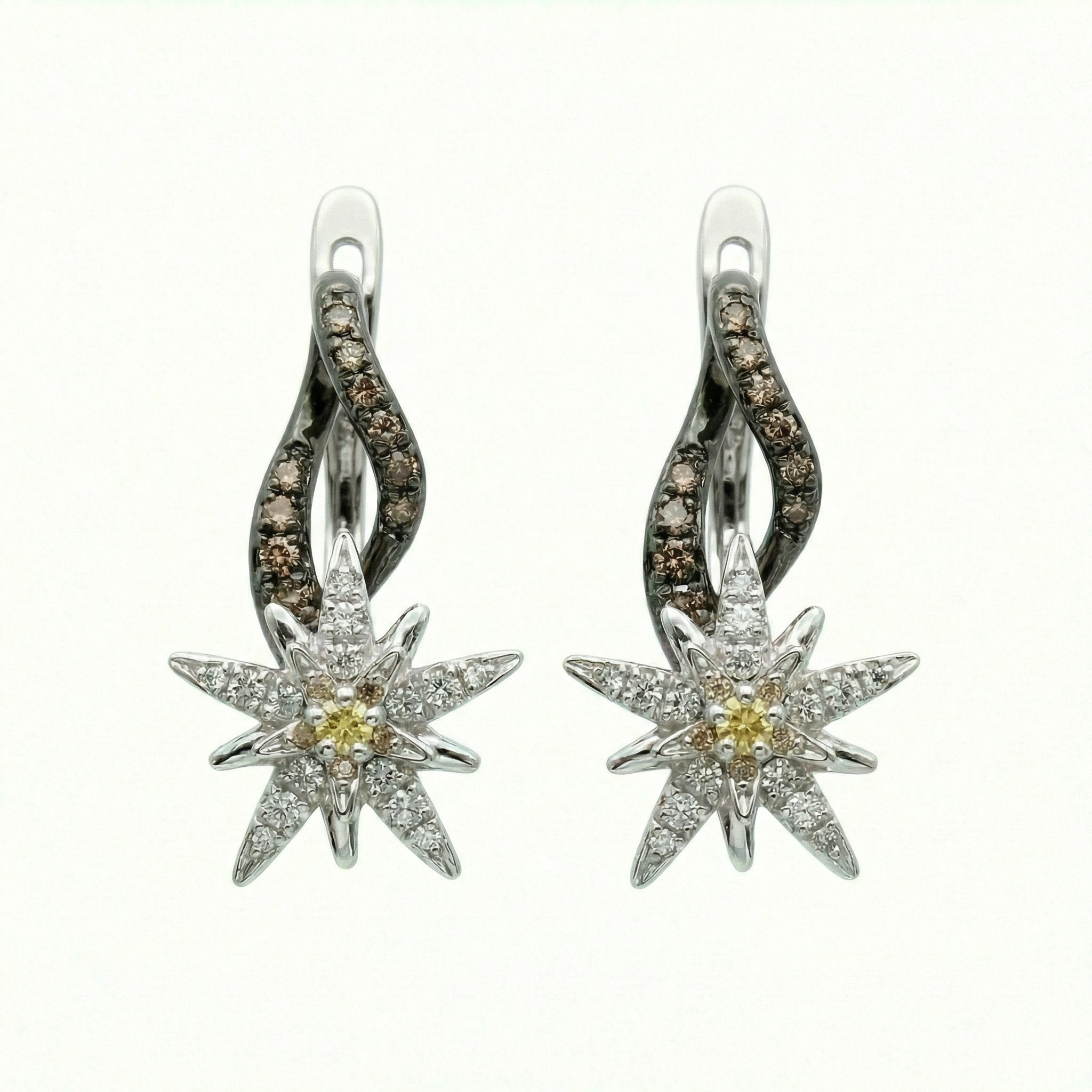 Les boucles d'oreilles fleurs « Terre d’Edelweiss » nous entraine dans un voyage en montagne, à la contemplation de la reine des Alpes. L’anneau surplombe la fleur d'un branchage d’or noir, teinte de tous les mystères. La fleur est saupoudrée de diamants blancs, avec au centre un diamant jaune qui rayonne comme un vif soleil d’hiver. Poids de diamants : un ensemble total de 0.70 carat de diamants blancs F VS sur la fleur, de diamants bruns sur l'anneau et d'un diamant jaune au centre. Poids d’or : 6,5 grs d’or blanc et d’or noir 18k (750/000). Dimensions fleur : 13mm de largeur. Fait main. Fabrication française.