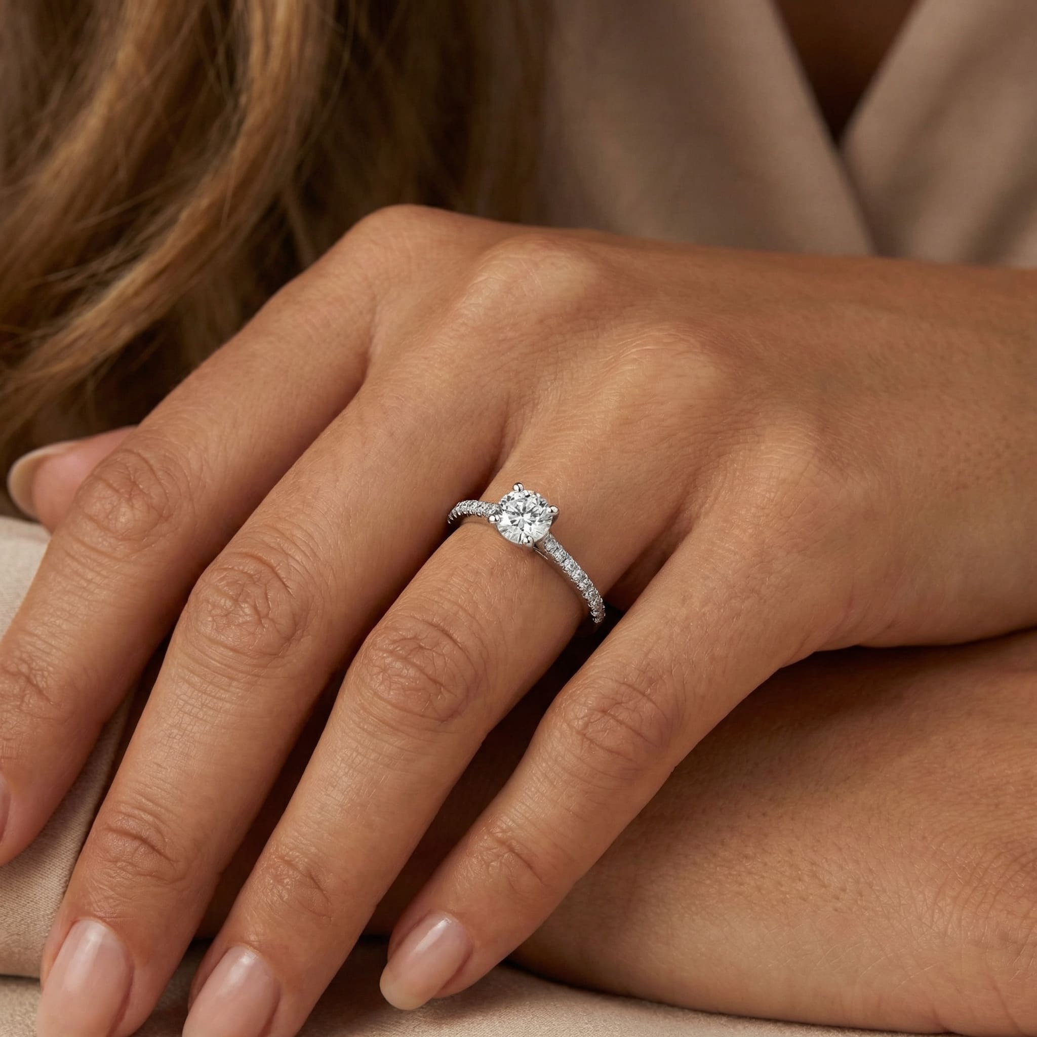 Nos bijoux sont sertis en France par des sertisseurs au savoir-faire français pour en garantir la qualité et la solidité. Anneau serti d'un pavage de diamants de chaque côté du diamant de centre et d'un poids total de +/- 0,20 carat selon le poids du diamant de centre. Qualité du pavage : couleur F et pureté VS. Largeur de l'anneau en proportion du diamètre du diamant choisi et des diamants de pavage, par exemple un anneau de 2mm de large pour un diamant de 5 mm de diamètre (0,50 carat).